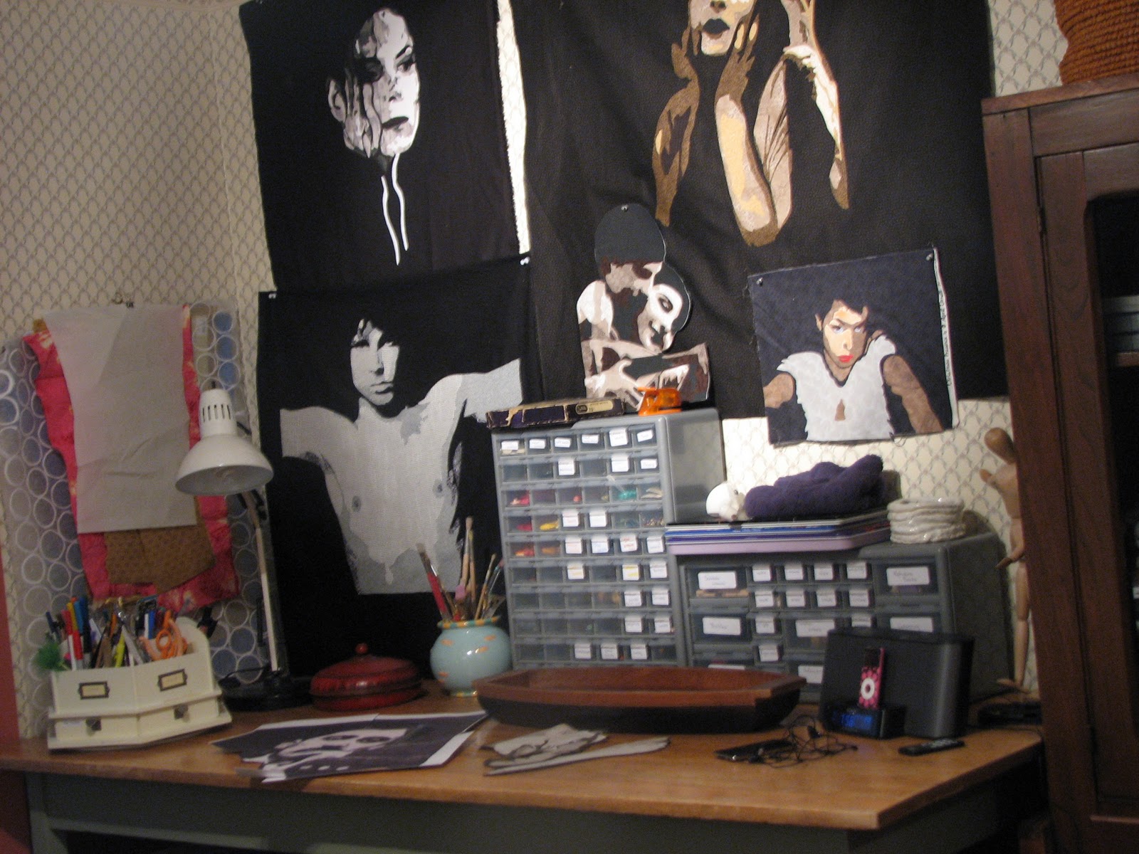 I have been busy moving my studio to its new location in the room previously known as my dining room. I am no longer relegated to the basement with the spiders. Here are a few peeks...